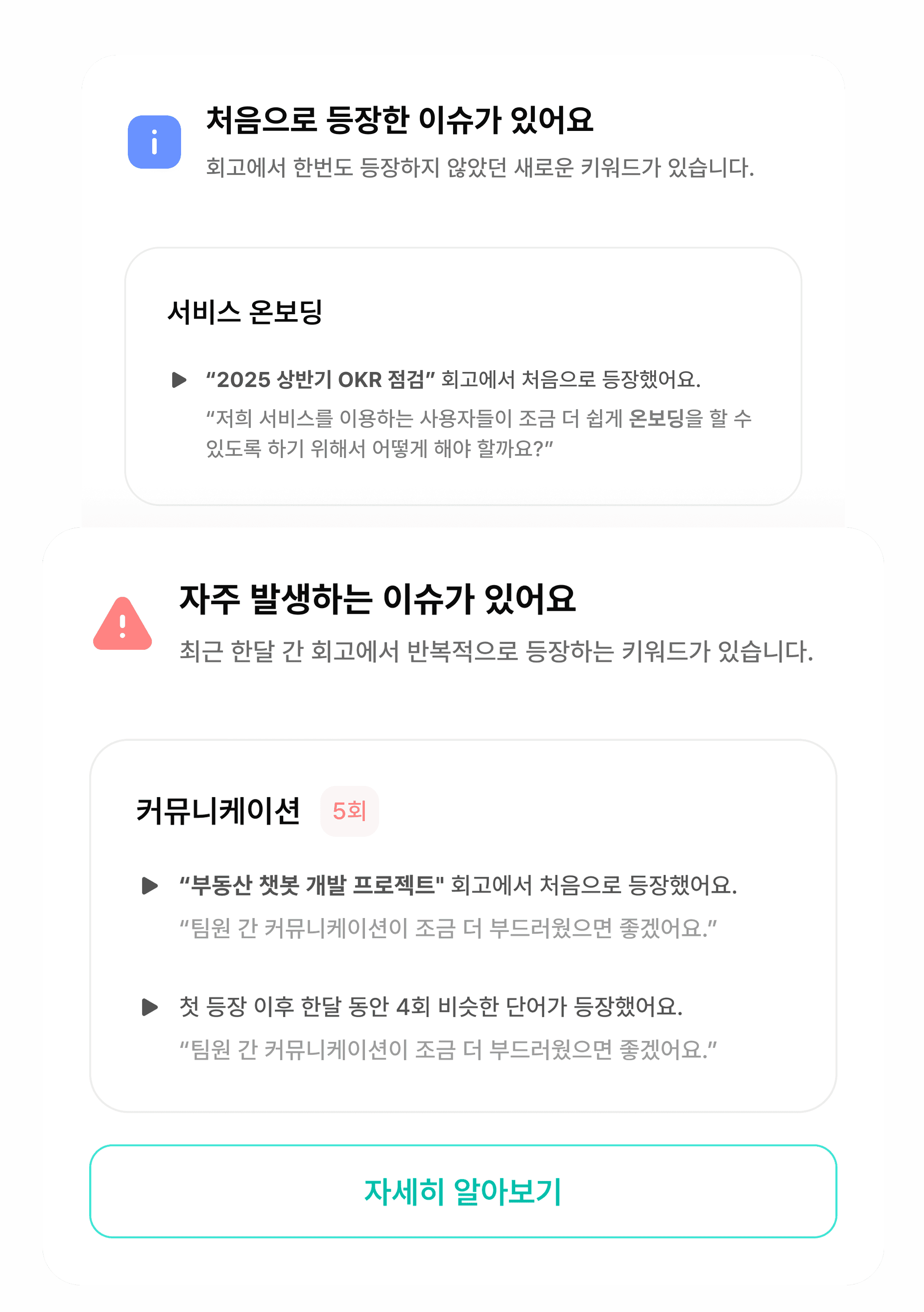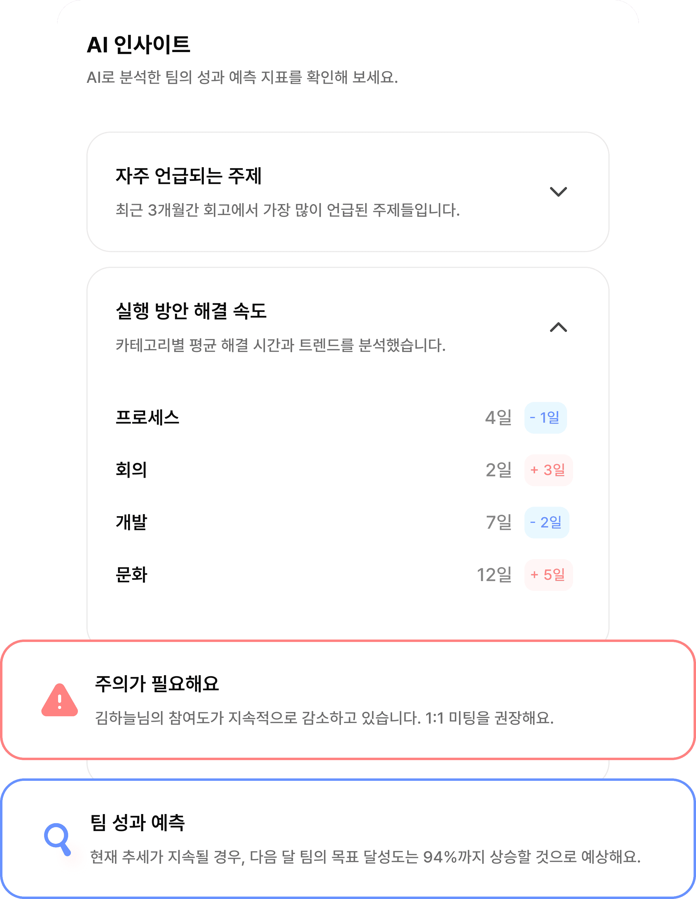 회고 데이터를 분석해 팀의 감정 상태와 이슈 패턴, 실행력을 정량화합니다.